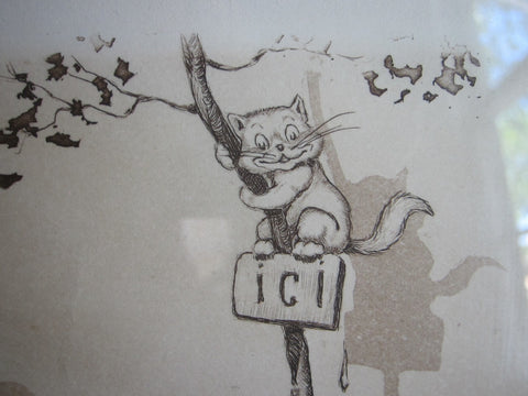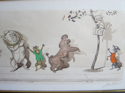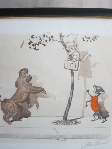 Framed hand-colored lithograph 'Le Malentendu' by Boris O Klein in the 1930's. Famous for his dog pieces Boris O Klein was a great humorist whose main art themes were (1) public urination; and (2) male-female flirtation or desire. This scene depicts a small act stuck up a tree with a sign saying "here" in an attempt to put the dogs off from using their usual watering. The cat seems to be a distraction for a more sinister plot that is revealed in another one of O Kleins prints in this series. This is signed and titled on the bottom of the print in pencil by the artist.