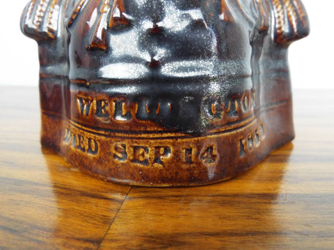 Antique Rockingham 19th C treacle glazed Lord Wellington memorial toby jug. Made in memorial of the Duke of Wellingtons death (1769-1852) who was the field marshal of Great Britain until his death. His passing was marked by a state funeral with all the usual adornments of a national military hero of the 19th century.