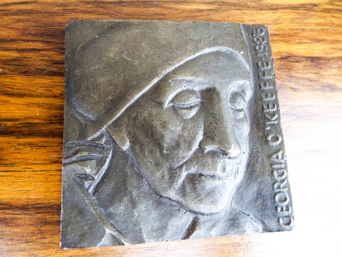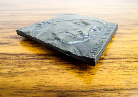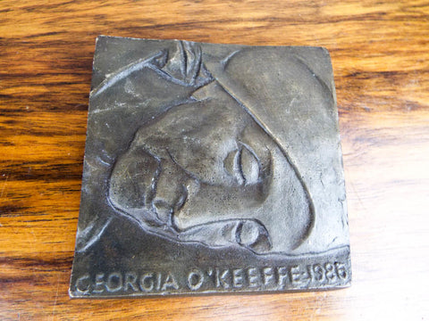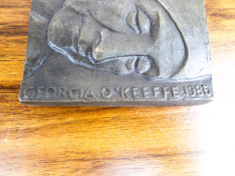 Vintage Alex Shagin bronze plaque of Georgia O'Keeffe. Decorative figural medallion depicts renowned artist Georgia O Keeffe on one side and an enlarged flowers emerging from a steer skull on the obverse both in high relief. Cast in 1986 in fine detail by Alex Shagin (signed on the edge A Shagin) along with the word Artum which is also marked on the piece to commemorate her life, she died in 1986. This is a tribute to the mother of American modernism beautifully executed by a talented artist.