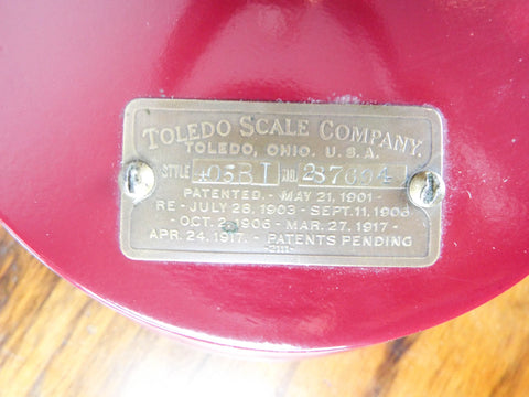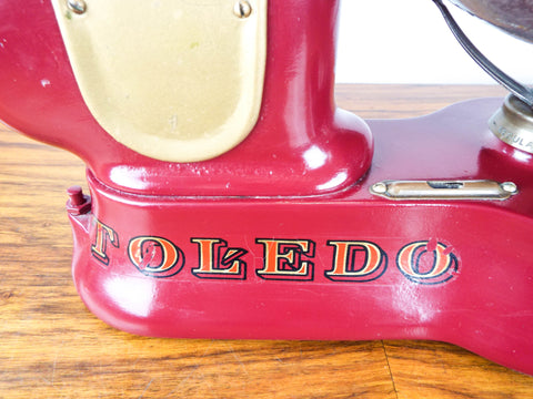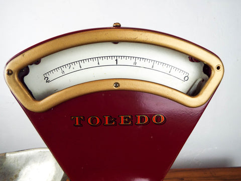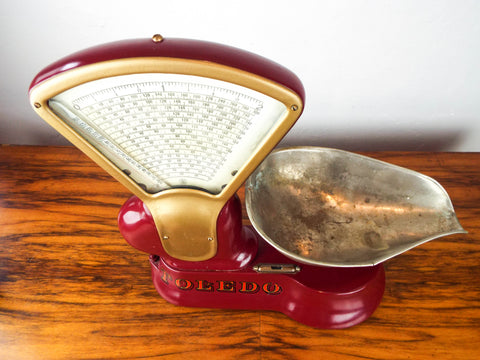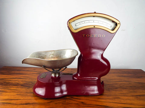 Vintage 1910's model style number 405 cast iron Toledo scale. The style number 405 is known affectionately as the Candy store model. Made during the 1910's this beautifully balanced scale is finished in a rich red color. Made in its name place of Toledo Ohio, USA this scale measures up to 2 lbs and retains its original brass pan.