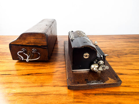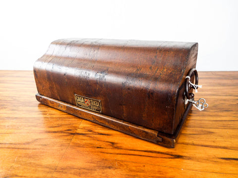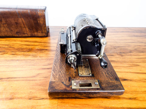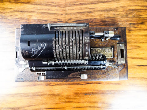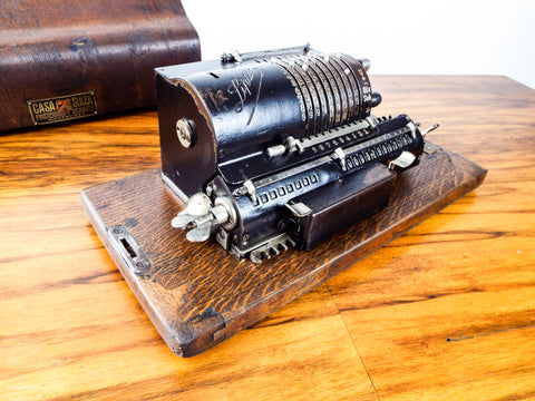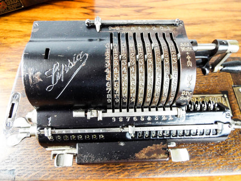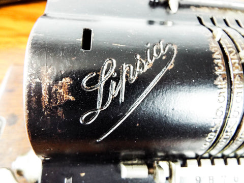 Antique mechanical pin wheel calculator dating to the 1920's. This is the Lipsia model 3 which dates from between 1920 and 1930. Complete in its original wooden carrying case with lock and key this pinwheel calculator was retailed by The Swiss firm of Finsterwald and Schaich in their Montevideo branch in Uruguay, SA. A rare and original working mechanical calculator which would suit any vintage scientific display.