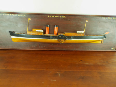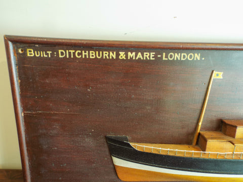 Antique late 19th C English paddle ship steamer half hull display. Dating to 1890 this half hull display represents a paddle steamer ship built by the prestigious London based firm of Ditchburn & Mare. Beautifully mounted this is ready to display in any property, ideal for the nautical or Victorian enthusiast.