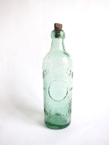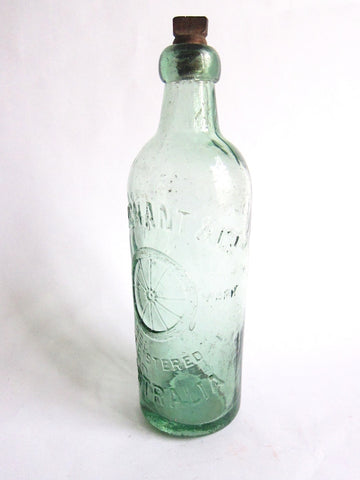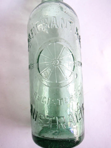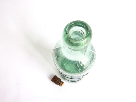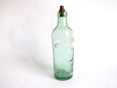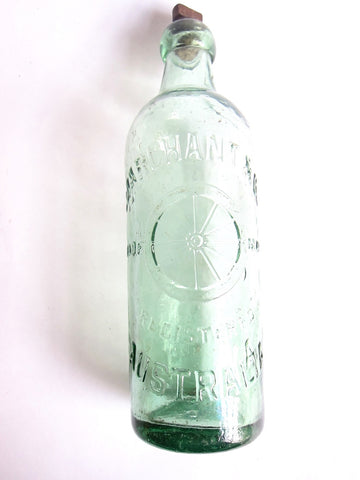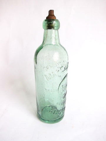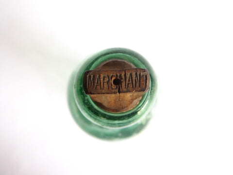 Antique aquamarine glass hand blown bottle. Heavy primitive home decor advertising Marchant soda with original wooden stopper dates to the late 19th century. Several companies manufactured these bottles but this maker J Madden of Camperdown is more desirable. This aqua marine blob top bottle has several air bubbles and imperfections but no damage.