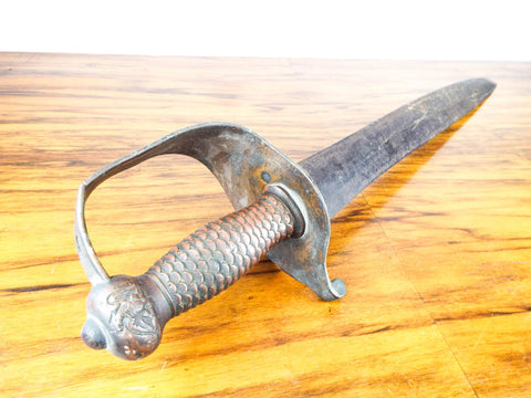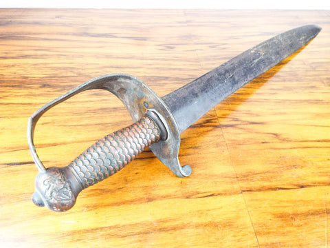 Antique American civil war naval cutlass. Short sword made for use in the Confederate Navy in the first year of the civil war. The brass handle is made in the style of a Roman gladius displaying fish scales which were popular during the 19th century. The ball pommel bears an American eagle with shield on either side. The blade is marked by the manufacturer Thomas Griswold & company from New Orleans, Louisiana and was manufactured between 1861 and early 1862 when the city was captured by the Union forces. Henry Thomas and Arthur Breese Griswold of New Orleans were arguably the finest CS sword makers of the war.