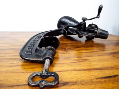 Antique cast iron victorian primitive cherry stoner made by Enterprise. This primitive table edge cherry stoner is made completely from cast iron, is adjustable.