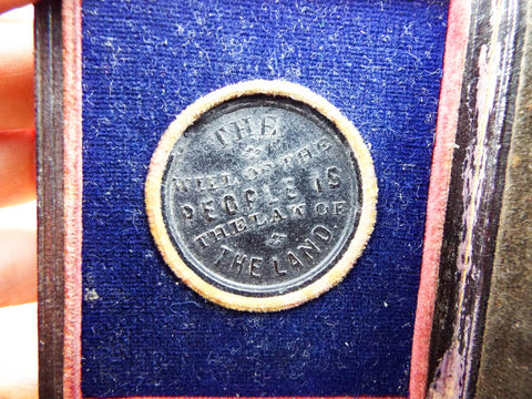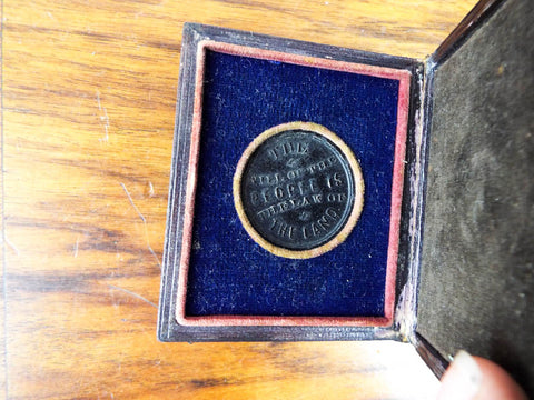 Antique civil war era Ulysses Grant presidential thermoplastic campaign token. Enclosed in its original leather daguerrotype case this token which is made from thermoplastic (sometimes misdescribed as gutta percha) in a high relief style on both sides. The obverse side depicts a bust of General U S Grant along with his name encapsulated inside a raised edge. The reverse side has the inscription " The will of the people is the law of the land". The token is suspended in its own central section which meant it could be displayed on a table with each side being viewed. This piece was manufactured prior to 1869 when he then became the 18th president of the United States.