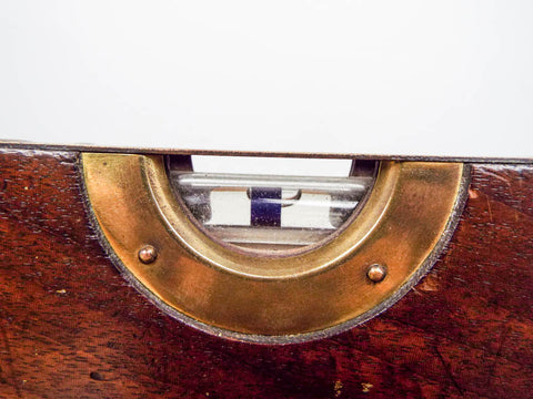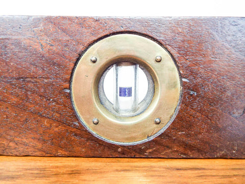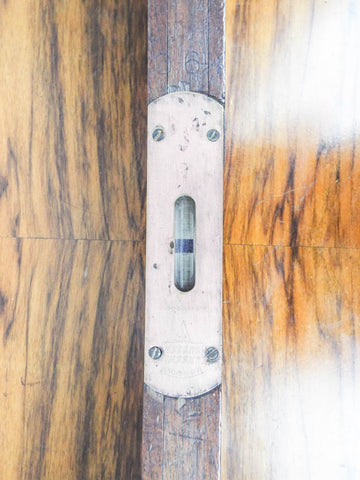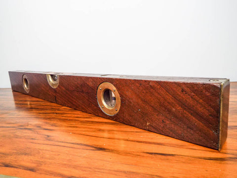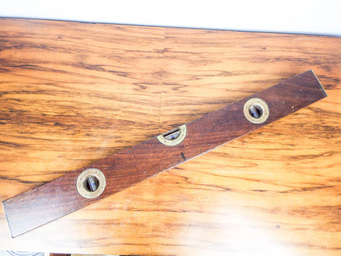 Antique 1904 wooden and brass centered E C Simmons Keen Kutter carpenters level. This vintage carpenters level is made from mahogany or rosewood with brass fittings and has both a vertical and horizontal level. Vintage tool dating to the early 1900s.