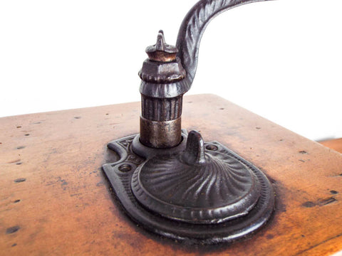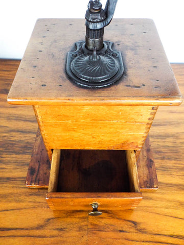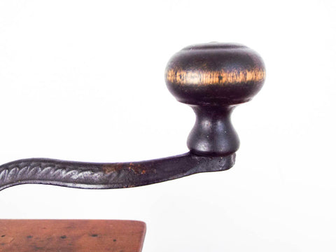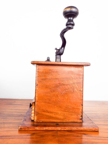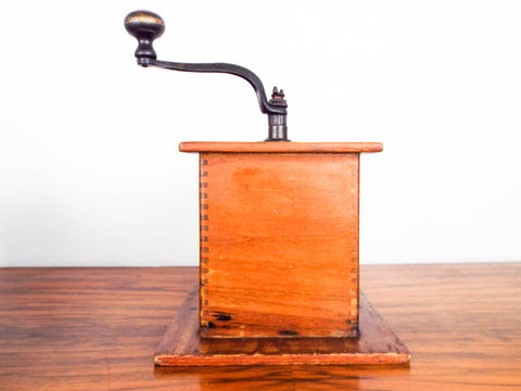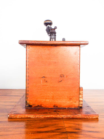 Antique primitive wooden hand crank coffee grinder. Dating to the turn of the last century this essential piece of kitchenalia ground the freshly roasted coffee beans to perfection without burning the beans. The fineness of the grind can be adjusted by tightening or loosening the nut on top. Beautifully constructed using finger jointing which was more symmetrical and more aesthetically pleasing to the eye it still retains the Victorian hardware of the cast iron handle and hopper top.