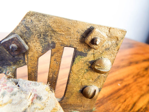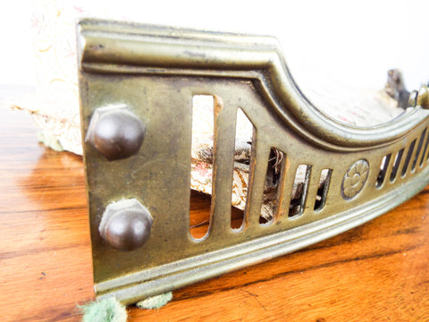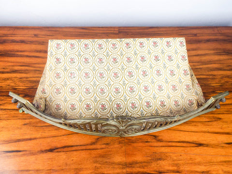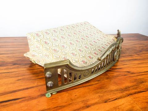 Antique Victorian brass fronted lecturn book holder. Constructed using a fabric covered wooden base tilting upwards this novel book holder stand has a pierced fret work front to hold the book in place. It could be used on any simple table or lecturn to transform it into a reader or oratorical platform during the late Victorian period.