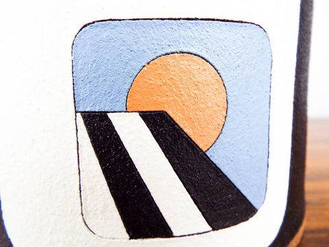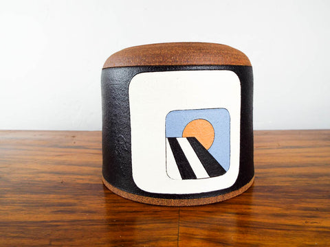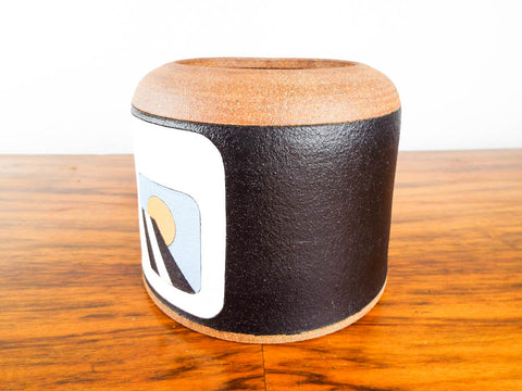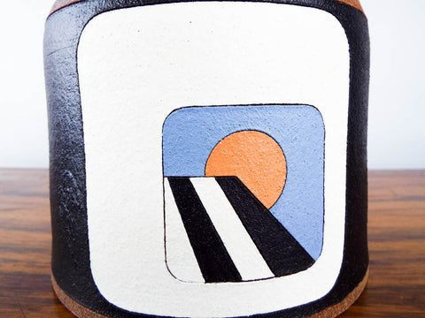 One off unique piece of pottery designed by New Mexico artist Terry Allen Rubin (b.1943). Designed in the 1970's or 80's this ceramic art vessel has southwestern colors and decor throughout. Its main design is depicted as what appears to be a sunset as observed from the inside of a white adobe on a black background. This appears to be part of a five part series all pertaining to the movement of the sun across the sky from a fixed point throughout the day.
