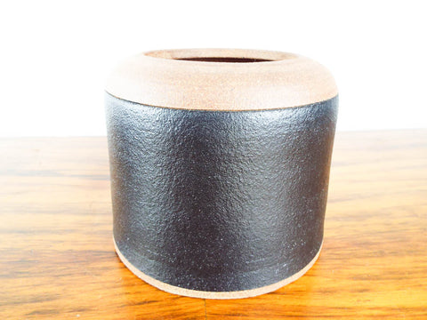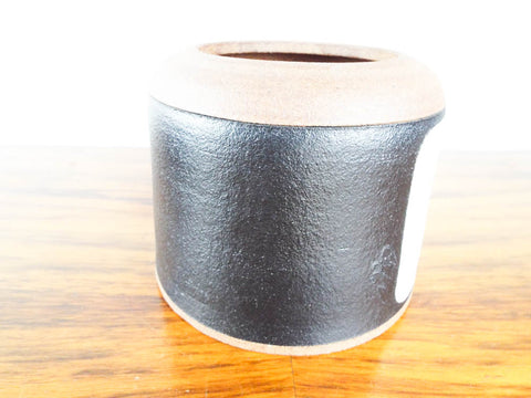 The colors of black white and natural terracotta and the geometric design interaction are typical of the south western style. This ceramic stoneware vase is signed on the side.