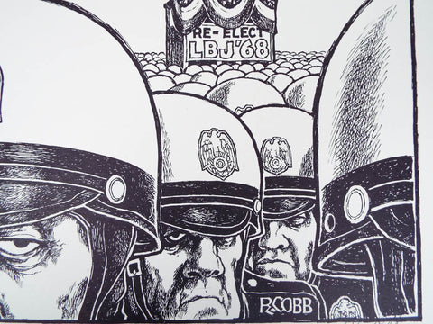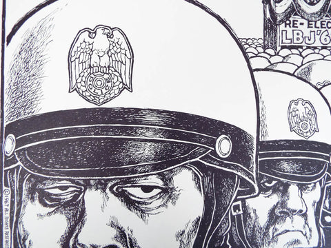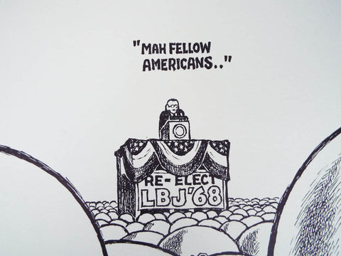 Vintage original unframed 1967 Signed Ron Cobb Print Ltd Ed 17 x 17 (image itself about 14" by 14") printed by Sawyer press and depicting LBJ making his famous opening presidential "Mah Fellow Americans" speech (emphasizing his Texan drawl) with a sea of militaristic armed police in front of him. Johnson faced further troubles when summer riots broke out in most major cities in the late 1960's and crime rates soared, support for Johnson declined as the public became upset with both the Vietnam war and the growing violence at home. Ron Cobb has been described as the greatest political cartoonist of the twentieth century.