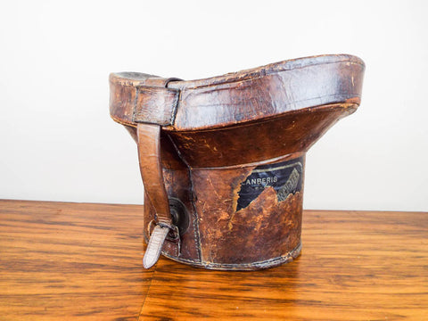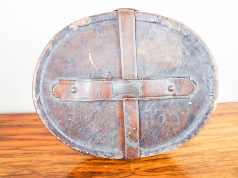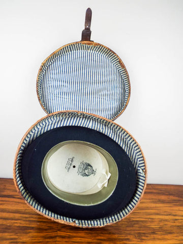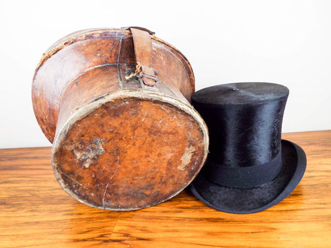 Antique crushed black silk plush top hat made by Youmans of New York around 1900. This beautiful size 6 and 5/8th gentlemans top hat retains the original Youmans logo on the inside along with the retail store it was made for along with the trademark ventilation hole on top. This stunning Victorian piece comes complete with a rather rare tapered brown leather and stripe lined interior travel case. These tapered cases were not very common then and are even scarcer now.