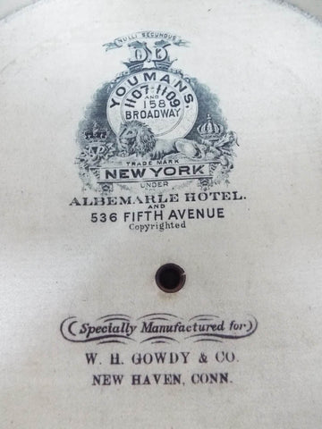 The Youmans logo and address is printing on the inside of the top hat long with "Specially manufactured for W H Gowdy & Co, New Haven, CONN.