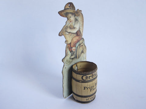 Antique wall hanging match holder of a little boy carving wood from a piece of a trunk. This vintage advertising match holder is advertising Ceresota Flour.