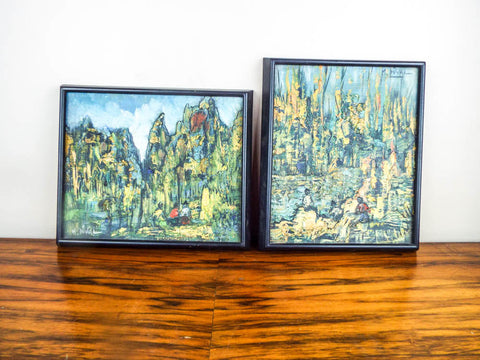 Vintage pair of oil landscape paintings. Beautiful palette knife paintings in an impressionistic style painted by M Duval. These stunning forest landscapes are beautifully colored with heavy swathes of palette paint showing figures in the foreground upon closer inspection. These date to the 1950's or 1960's.