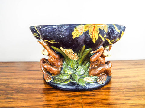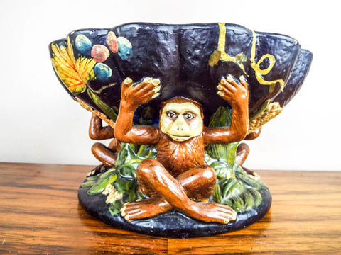 Vintage unique ceramic Majolica monkey bowl. Vintage figural tropical fruit bowl upheld by cross legged seated monkeys. The inside top of the bowl is ornately painted with a plethora of fruit and leaves which is aesthetically appealing even when it is empty. There are no makers marks on it except fro the number 114 which may refer to the design number. Colors are rich and bright which make it an ideal dinner table fruit bowl or as a decorative key bowl.