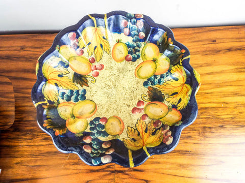 Majolica bowl measures 8" base diameter by 11" bowl diameter by 6.5" tall and weighs 7lb 14oz.