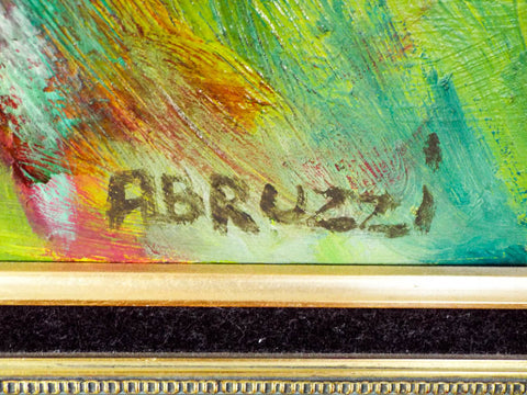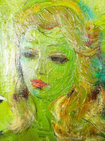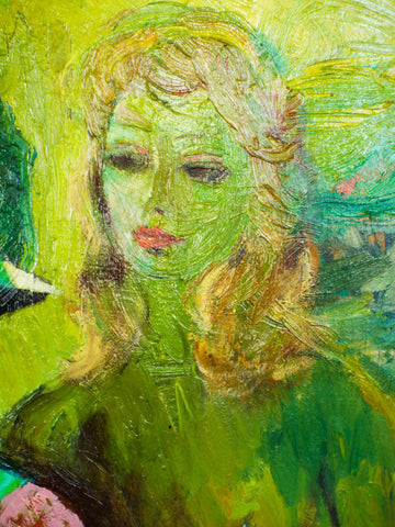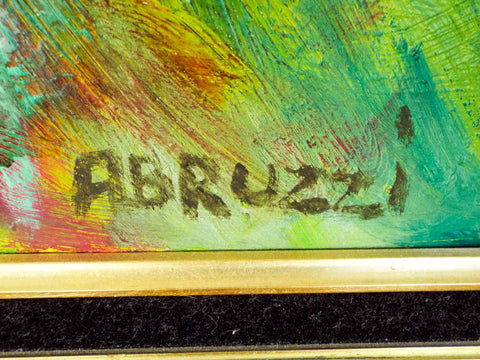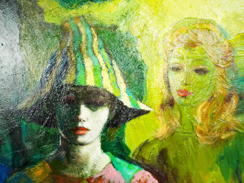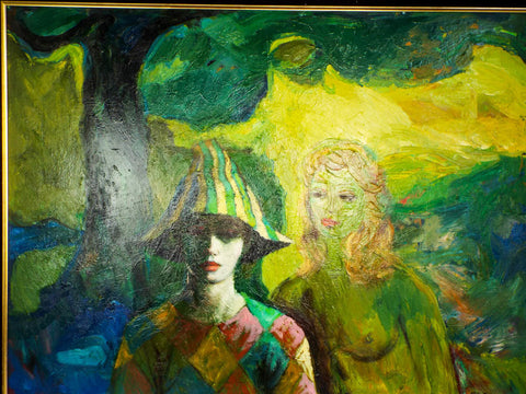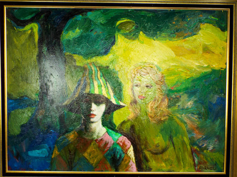Vintage oil on masonite painting by Harold Stephenson (1908-1974) aka Abruzzi. Painted in whimsical style reminiscent of Chagall and Picasso it depicts a harlequin with a hat partially in the shadows. On her right is a nude female and the background features a specter like figure hovering pointing to a tree on the left. The bright colors of the harlequin are quite the contradiction with her eyes and the overall theme of this painting. The large expanses of bright yellow and green which dominate the center of the picture are almost iridescent which are neatly encompassed by the dark blues, greens and black of the edging of the painting.