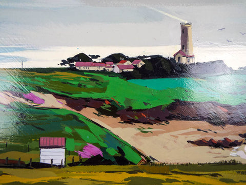 Large signed oil on board landscape. Acrylic painting of a land/seascape along the coast with a lighthouse scene. Well painted nautical piece using bright colours to intimate an evening skyline over a headland. This large impressive painting would make a great addition to any large room in a modern type of property.