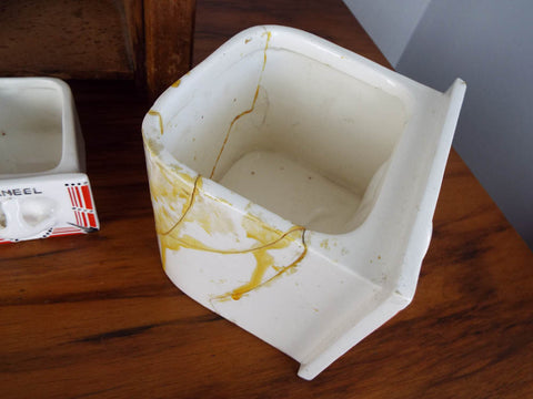 In generally fair condition with signs of use commensurate with age. There are 4 larger drawers that are missing but these are now open shelves which can be used for storage. The large Meel drawer has been smashed and repaired, as has the smaller Foelie drawer (please see all pictures as they form part of the condition description).