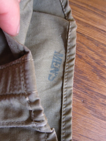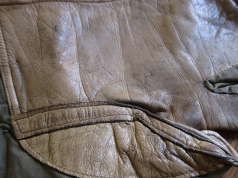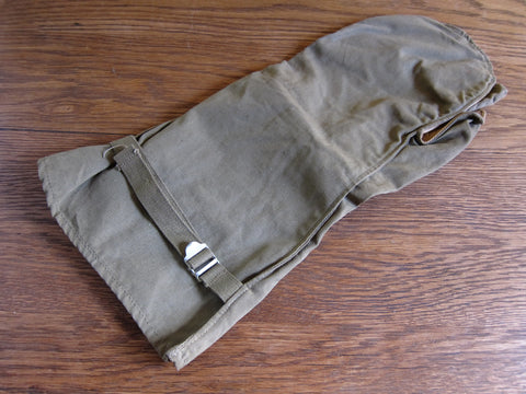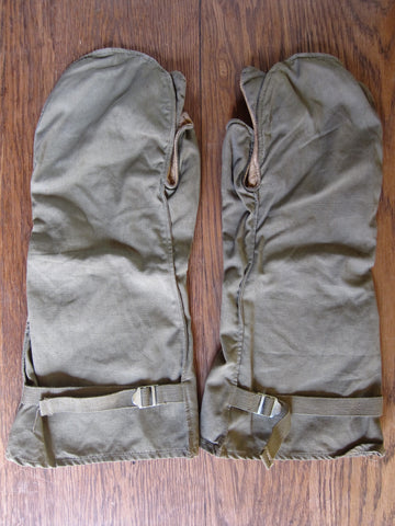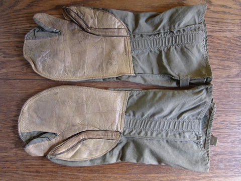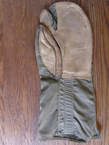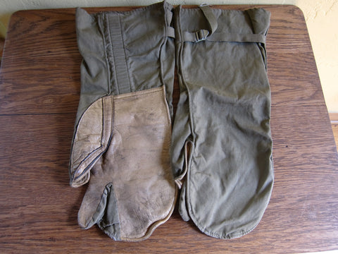Vintage WW2 memorabilia era machine gunners gloves made from canvas and leather on the palms. These ww2 gear gloves are adjustable on the back to tighten over under gloves if needed. The trigger finger and thumb are separated for easy maneuverability and access to the movable parts of the gun. These would make a great addition to any ww2 memorabilia / military collection.