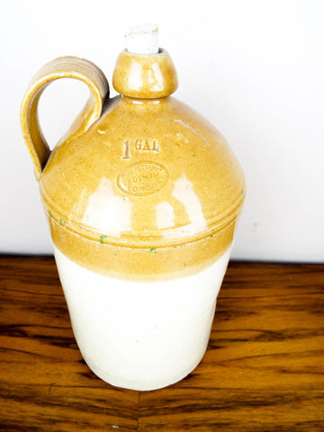 Antique English stoneware 1 gallon jug. Salt glazed vintage alcohol crock made around the 1910's for local grocer Harry Inwood of Collingdon st, Luton England. This style of flagon was popular from the 1880's. Complete with original cork bung the information is embossed on the actual body of the jug along with a doulton style handle.