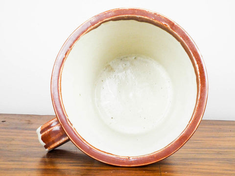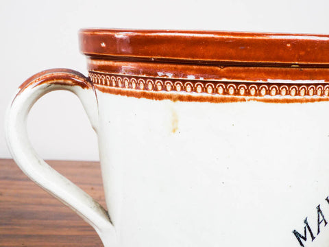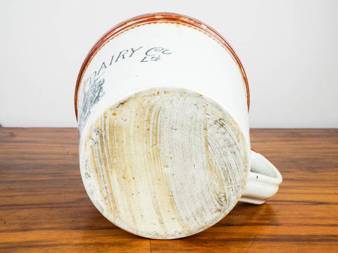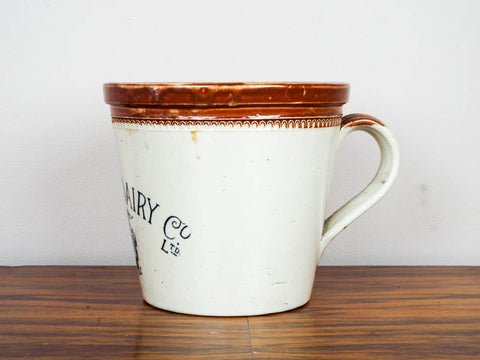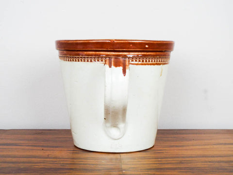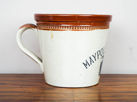 Original late 19th century stoneware 4lb crock butter / lard tub with handle. This antique stoneware is embossed with a decorative rim glazed in a bright coffee brown which contrasts superbly with the off white colored body. The transfer image on the front depicts children dancing around a maypole underneath the company name "Maypole Dairy Co Ltd". The 4lb size is impressed beneath the handle. This is a strong and practical jug which could be used in an everyday kitchen or simply displayed as a decorative item.