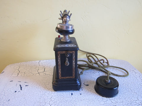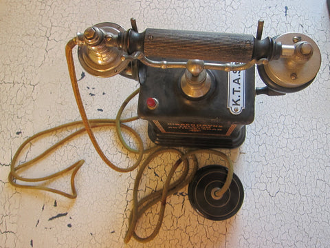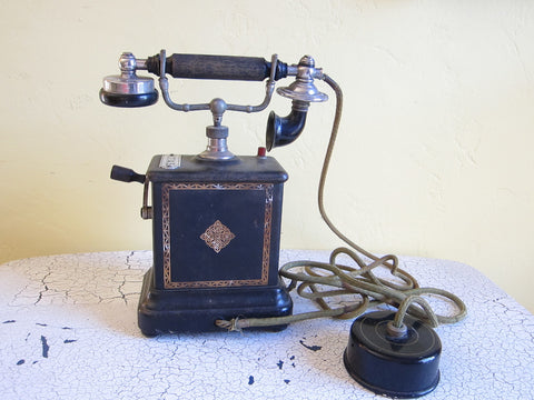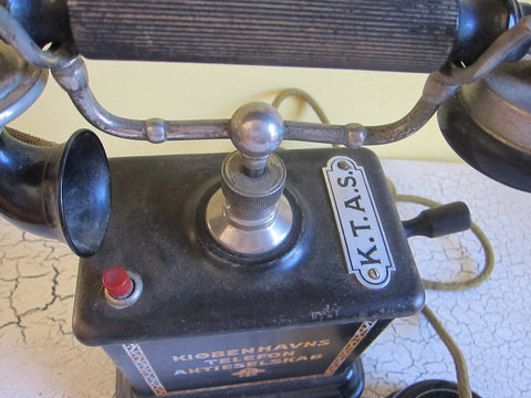 Antique Telephone by Ericsson. This Danish hotel table hand crank vintage phone was made in Stockholm, Sweden for the Danish market between 1908 and 1914. Only the antique phones from Denmark had the red bakelite cut out button as seen on this model.