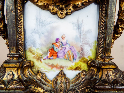 Antique French Louis XV Style 19th C metal & porcelain Sevres style mantel clock. Very ornate ormolu mantel clock decorated with swag, gadroons, cherubs and mythical birds on the main frame with acanthus splayed feet. Deftly decorated with Sevres like painted porcelain on the face and urn with floral decor, the main porcelain panel depict s a courting couple in a garden backdrop. This is the height of French opulence which would grace any mantel not only as as aesthetic decoration but also as a working timepiece.
