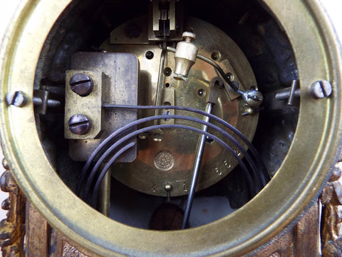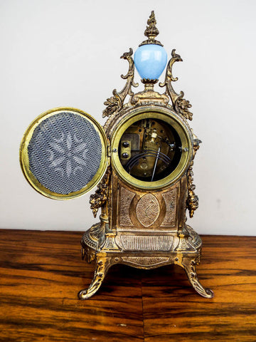 In good condition with some loss of plating throughout. Winds up easily and strikes on the hour, it could do with a service as it is running a little fast. No cracks or damage to any of the porcelain - please see all pictures as they form part of the description.