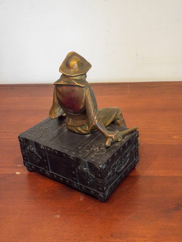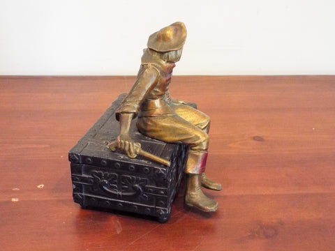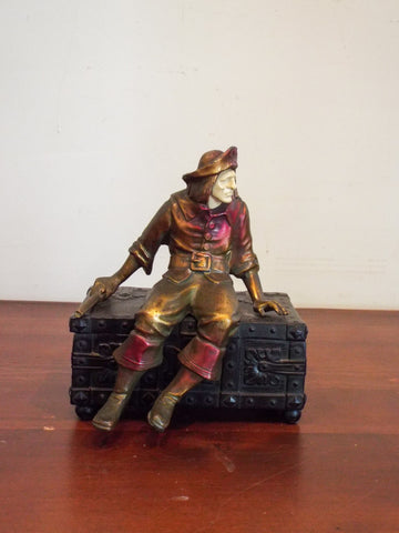 Antique 1920s era musical jewelry box. Disguised as a pirates treasure chest complete with a menacing looking pirate sitting on top of it holding a pistol on one hand this music box activate when opened up. the pirate is painted gold with his face painted in a whitish skin color whereas the chest is of a dark brown meant to resemble iron.