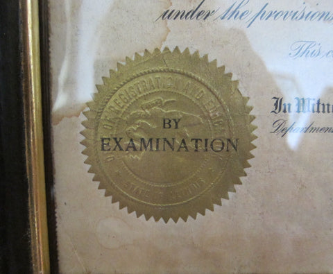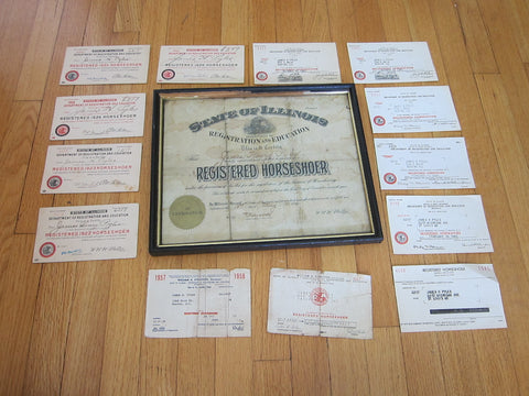 Vintage framed registration and education certificate for a registered horseshoer / farrier in the state of Illinois in 1921. There are also an additional 12 years of license included which are smaller in size to be carried in person as proof of credentials. Quite a unique record of an individuals education with a great interest for the equine community or blacksmithing enthusiast. A great addition to your curiosity collection, or home decor for the man cave.