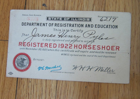 1920's Vintage Wall Hanging Illinois Registered Farriers License