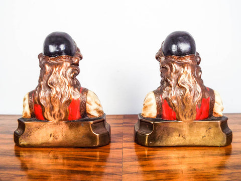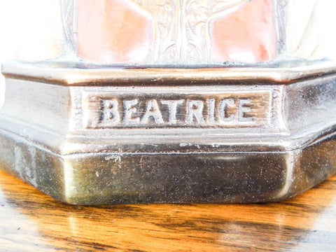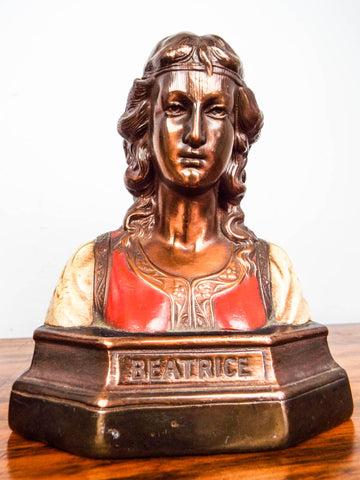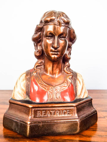 Vintage pair of decorative bookends. Unique pair of bronze clad plaster bookends of Beatrice made by the Armor Bronze Co.  Each Beatrice retains its original polychrome paint.  These were most likely originally paired with their male counterparts, Dante manufactured by the same company.  Dating to the circa 1920's.