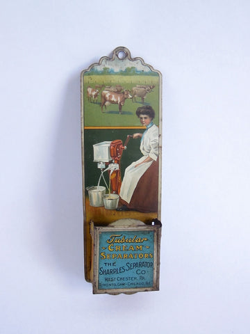 Antique wall hanging match holder showing a lady operating a cream separator appliance. This vintage advertising match holder is advertising Sharples Tubular Cream Separator and has a serrated match striker on the bottom of the holder.