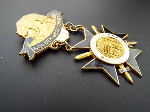 Vintage Native Sons of the Golden West commandery medal. Bar and medal representing the Los Angeles chapter of the Golden West commandery. The bar depicts the golden bear of California over the banner which suspends a Maltese cross. This surrounds the great seal of California which has two swords either side.